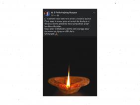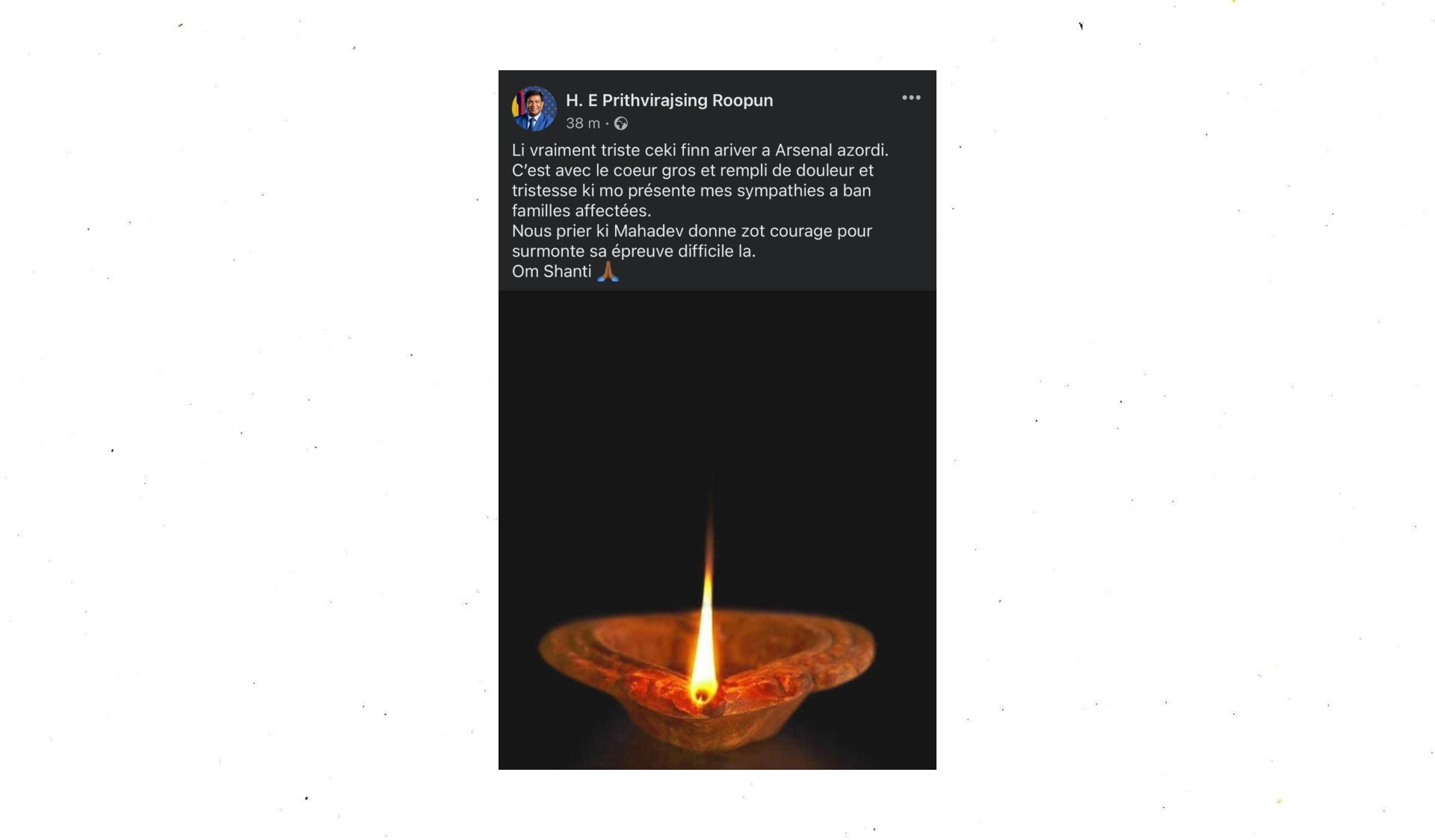 Le Président de la République Prithvirajsing Roopun a également exprimé ce soir ses condoléances aux familles des victimes sur sa page officielle de Facebook. Cela suite à l'incendie mortel survenu à Arsenal où 6 pèlerins ont trouvé la mort après qu’un kanwar a pris feu en ce début de soirée. Il se dit profondément attristé. Selon un dernier bilan émis par la National Task Force, dix pèlerins ont également été blessés.