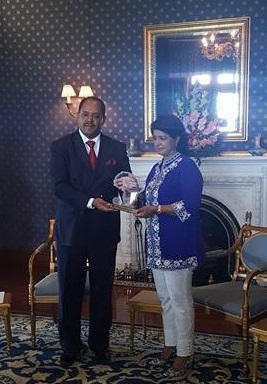 L'ambassadeur Mussie Hailu, du United Religions Initiative a remis l'Africa Peace Award a la présidente de la République, le Dr Ameenah Gurib-Fakim ce jeudi a la State House a Réduit. Cet Award est une reconnaissance de la contribution du Dr Ameenah Gurib-Fakim dans le domaine de la recherche scientifique sur le continent Africain, mais aussi son engagement a promouvoir une culture de paix et d'harmonie. C'est aussi une récompense pour ses publications, entre autres sur l'usage des plantes médicinales africaines. Le URI a crée le Africa Peace Award en 2003 avec l'idée de promouvoir un développement soutenu en Afrique dans le respect de la démocratie et de la bonne gouvernance, tout en reconnaissant un leadership efficace dirigé vers la paix et la sécurité sur le continent Africain.