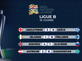En Ligue B, l'Angleterre a écrasé la Grèce 3-0, avec des buts de Burtis Jones, Ollie watkins et un csc des Grecs. Toujours dans le groupe 2, l’Irlande a battu la Finlande 1-0. Dans le groupe 3, la Norvège, portée par Haaland, a dominé la Slovénie 4-1 et l'Autriche a gagné 2-0 contre le Kazakhstan.